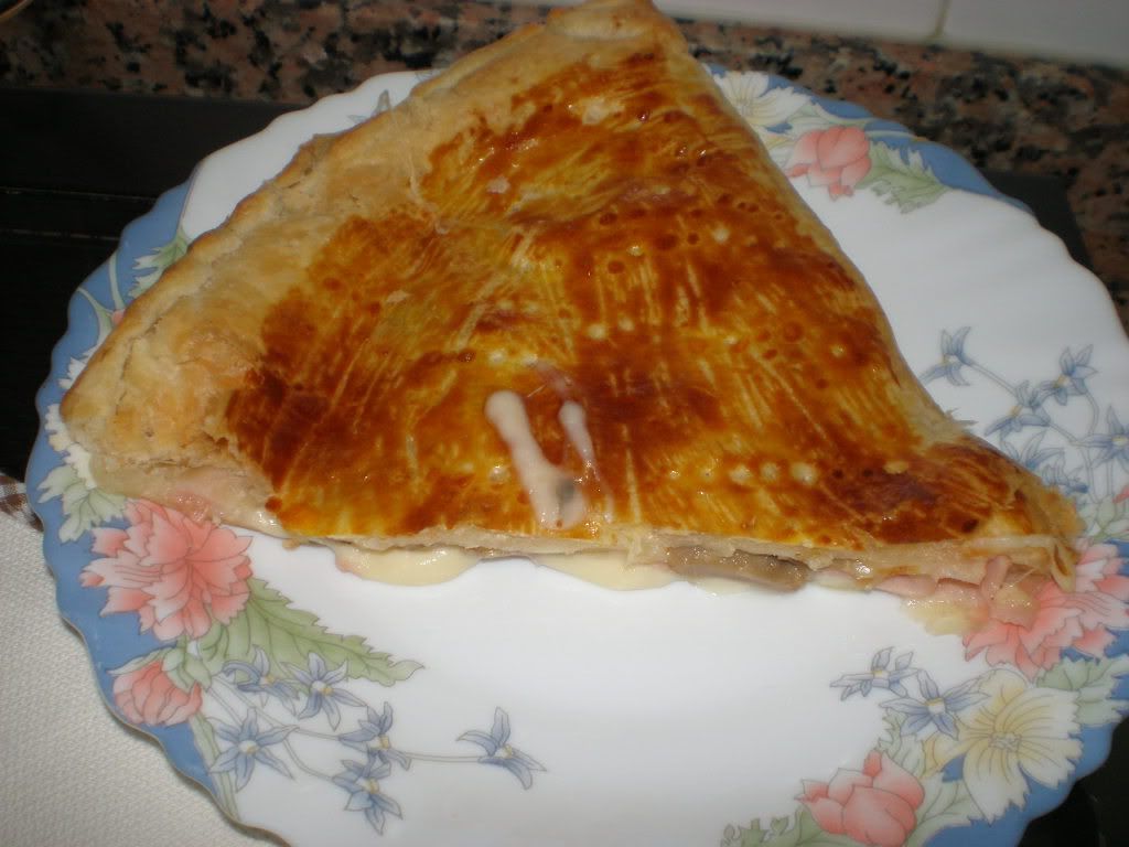Folhadão de queijo, fiambre e cogumelos
