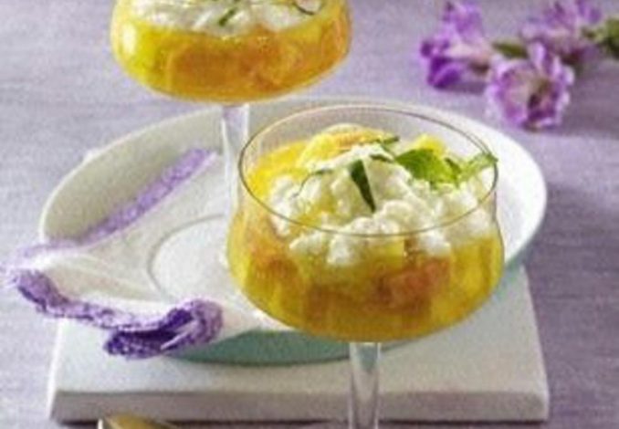 Ferva o leite juntamente com o leite de côco e 1 pitada de sal. Adicione o arroz e deixe cozinhar mexendo ocasionalmente por cerca de 30 min. Descasque o ananás e corte a parte dura. Corte o ananás em cubos pequenos. Descasque a manga e corte finamente em cubos. Remova as sementes da papaia. Descasque a papaia e corte finamente em cubos. Ferva 1/4 l de sumo de ananás, adicione as frutas e deixe ferver brevemente. Misture o amido de milho com 1 colher de sopa de sumo de ananás até ficar homogéneo e adicione as frutas, mexa até ligar tudo muito bem e deixe novamente ferver. Deixe arrefecer a fruta. Misture o côco ralado e o açúcar ao arroz, mexa e deixe arrefecer. Encha copos ou taças de sobremesa com a fruta e despeje o arroz doce por cima da fruta. Lave e seque a erva cidreira. Corte as folhas de erva cidreira excepto algumas para a decoração em tiras. Decore o arroz doce com as tiras e as folhas de erva cidreira.