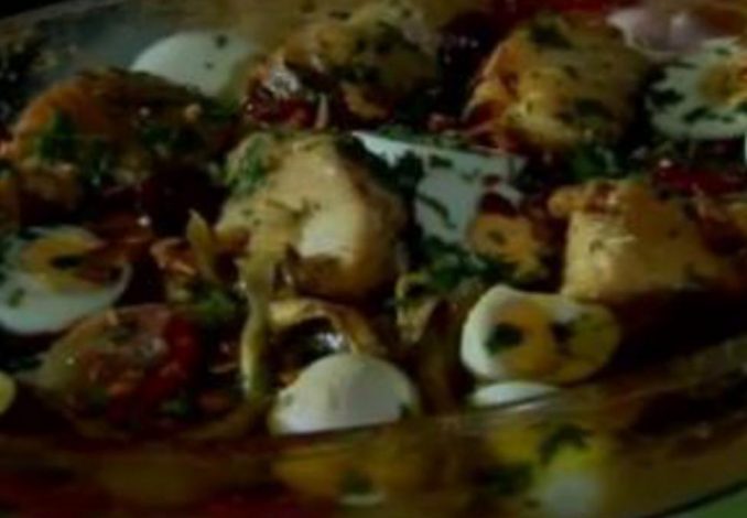 Unte uma travessa com azeite. Faça camadas com os ingredientes começando pela batata, bacalhau, pimentões, tomates, cebola. Repita até acabar esses ingredientes. Antes de levar ao forno salpique o pó da pele do peixe. Leve ao forno por aproximadamente 2horas ou até ficar duas camadas, uma de água e uma de azeite. Antes de servir, decore com ovo cozido, salsinha e alho frito.