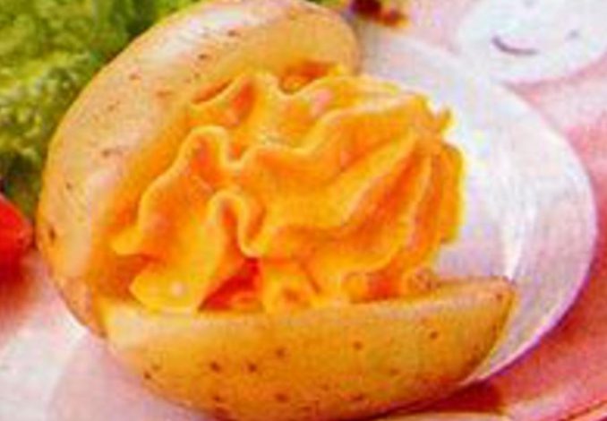 Retire as batatas do forno, distribua nos pratos, parta-as ao meio sem separar as partes e disponha dentro um pouco do queijo cheddar. Sirva com salada de alface e tomate, temperada com sal e azeite de oliva.