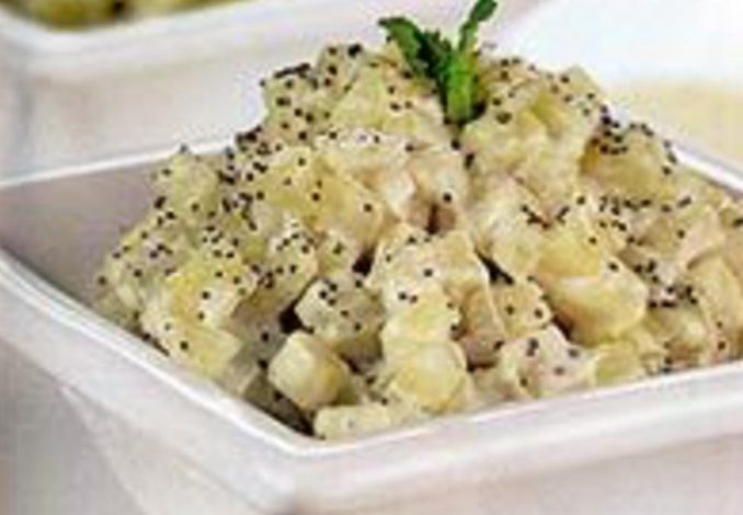 Polvilhe as sementes de papoula e retire do fogo. Decore com hortelã.
