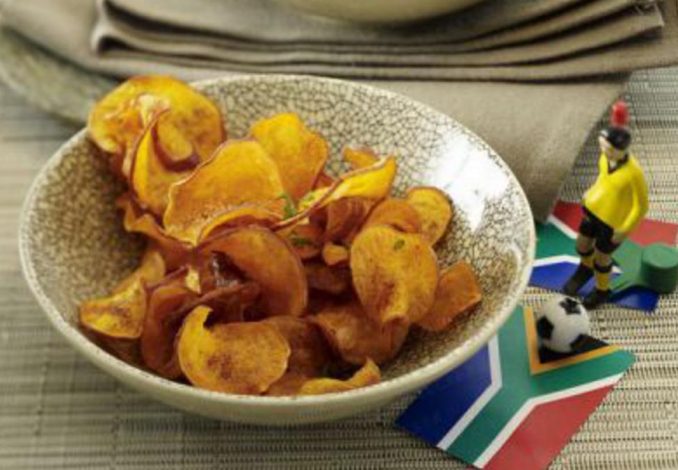 Lave bem as batatas e corte com um cortador em rodelas bem finas. Polvilhe as rodelas de batata levemente como amido de milho. Aqueça o óleo a 170 ° C e frite as rodelas de batata em porções por cerca de 2 minutos. Retire e escorra em papel absorvente. Misture a canela com o sal e tempere os chips com o mesmo. Lave, seque e pique a salsa. Sirva os chips em tigelas e polvilhe com a salsa. ******Geniet jou ete****** ******Forca Portugal******