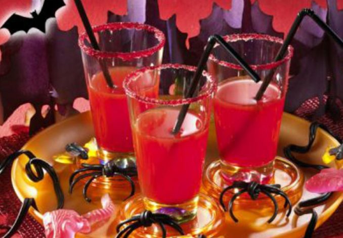 1. Tinja o sumo de laranja com o corante vermelho (retire um pouco de sumo para as bordas dos copos) e misture o ginger ale e o sumo de maçã. 2. Despeje num prato o restante sumo vermelho que reservou, ponha também o açúcar num prato. Molhe as bordas dos copos com o sumo e depois com o açúcar. Encha cuidadosamente os copos (0,3 l) com a "bebida de sangue" e sirva.