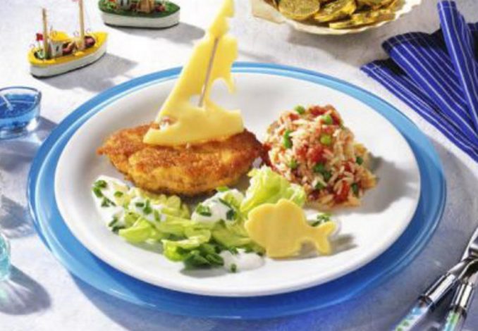 Limpe, lave e corte a alface em pedaços e deixe escorrer bem. Lave, seque e corte a cebolinha em rolinhos. Misture o quark com o leite e os rolinhos de cebolinha, tempere com sal e pimenta e coloque no frigorífico. Descasque e corte a cebola em cubos. Aqueça a manteiga num tacho e refogue a cebola na mesma. Adicione o arroz às ervilhas congeladas e os pedaços de tomate e tempere com sal e um pouco de pimenta. Regue com o caldo de legumes. Deixe ferver e cozinhar em tacho tapado em lume brando por cerca de 20 min. Mexa de vez em quando. Entretanto coloque as febras entre duas folhas de película e estique-as com o rolo da massa. Corte as fatias de fiambre ao meio e coloque em cada febra (mas só em metade da febra) uma metade de fiambre e dobre a outra metade da febra sobre o fiambre a tapar. Bata o ovo com sal e pimenta num prato fundo. Coloque a farinha e o pão ralado em pratos fundos mas separados. Aqueça o óleo numa frigideira, passe primeiro as febras por farinha, depois por ovo batido e por último em pão ralado e frite no óleo quente por cerca de 5-6 min. virando de vez em quando. Retire as febras da frigideira e deixe repousar um pouco. Para as velas: Corte as fatia de queijo ao meio na diagonal, espete as velas num espeto e coloque por cima da bifana pirata (pode recortar peixes com as outras fatias de queijo). Coloque a bifana pirata e montinhos de arroz em 4 pratos, coloque a salada à frente da bifana e arroz como ondas, regue a salada com o molho de quark tipo espuma, decore com os peixes de queijo e sirva de imediato. ******Guten Appetit******