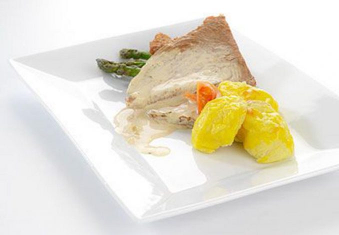 Bata os bifes com uma colher de pau para que fiquem mais tenros e reserve-os no frigorífico. Coza as batatas com pele em sal e gengibre. Quando cozidas retire a pele e passe-as por um pass-vit. Leve o puré ao lume e adicione a Alpro Bebida de soja Natural e 80g de Alpro Creme de soja para Cozinhar e Assar. Tempere com sal, pimenta e um pouco de noz-moscada. Coloque o puré num recipiente para ir ao forno e pincele-o com uma gema de ovo, levando ao forno até ficar dourado. Prepare uma salada de espargos: lave os espargos e coloque-os num grelhador. De seguida, num recipiente misture os espargos, o tomate cherry e tempere com sal, salsa, e vinagre (balsâmico de preferência). Numa frigideira, coloque 80g Alpro Creme de soja para Cozinhar e Assar e os alhos esmagados. Quando estiver quente adicione os bife já temperados com sal e pimenta. Deixe corar bem e reserve. Adicione, na frigideira, os 400ml de Alpro Alternativa de soja às Natas Culinárias e quando estas tiverem mais espessas acrescente o sumo do limão e retifique os temperos.