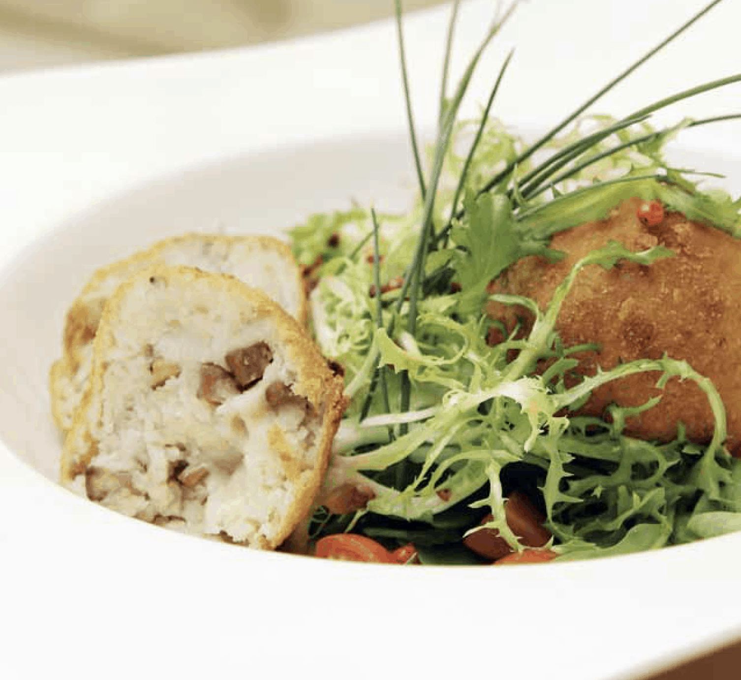 Passe-as por farinha, o ovo batido e pão ralado. Frite-as no óleo de amendoim bem quente; retire-as e escorra-as sobre papel absorvente. Sirva as bolinhas de batata com uma salada verde, tomate-cereja e pimenta rosa em grão.