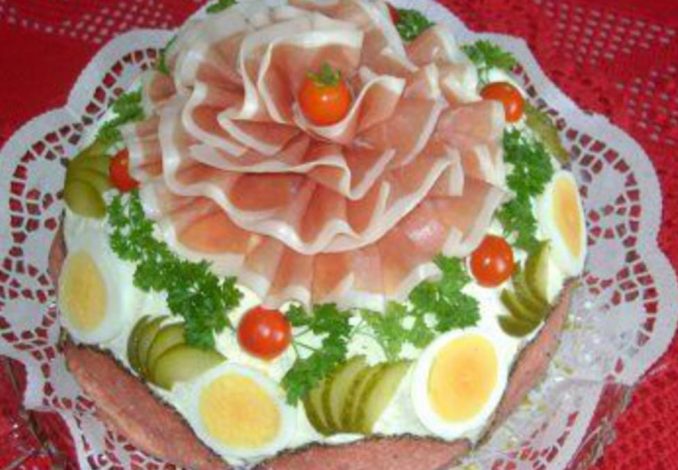Corte o pão duas vezes ao meio como se fosse uma torta. Corte a barriga de porco defumada e 3 ovos em cubos pequenos. Barre o pão com a cebola e espalhe uniformemente os cubos de barriga de porco, ovos e o rabano nas camadas de pão. Forme outra vez o pão, pressione bem e barra todo o pão com manteiga. Agora barre todo o pão muito bem com o creme de queijo. Decore começando por baixo com as rodelas de salame, rodelas de ovos, pepino de conserva e os tomates e por último coloque o presunto ou bacon no topo do pão em forma de flor e decore com a salsa.