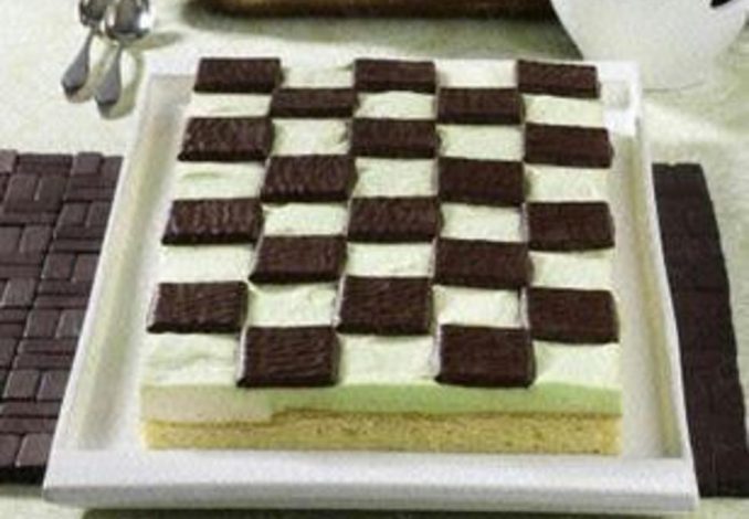 Para o bolo: Separe os ovos das gemas e claras. Bata as claras, com 2 colheres de sopa de água, em castelo e deixe escorrer lentamente 50g de açúcar, sal e o açúcar de baunilha sobre as claras batidas em castelo. Adicione as gemas e misture bem. Misture a farinha com o amido de milho e o fermento, adicione as porções e envolva com a massa de ovos. Forre um tabuleiro do forno (32 x 39 cm) com papel manteiga, faça uma faixa forte com a folha de alumínio e divida o tabuleiro ao meio com a mesma de maneira a ficar bem isolado. Despeje a massa em metade do tabuleiro e alise, leve a cozer em forno pré-aquecido a 200 ° C por 8-10 min. Depois de cozido o bolo retire do forno, desenforme e deixe arrefecer sobre uma grade. Amoleça a gelatina em água fria. Bata cremosamente o quark com o mascarpone e 75g de açúcar. Esprema e dissolva a gelatina, misture 4 colheres de creme de mascarpone com a gelatina e em seguida misture com o restante creme. Divida o creme em 2 partes iguais. Misture a uma metade do creme o licor e o xarope de menta. Bata as natas em castelo e divida também as natas. Envolva cada metade de natas com as metades de creme. Retire o papel manteiga do bolo e coloque numa bandeja/placa de bolos e coloque um anel de bolos em torno do bolo da parte inferior. Coloque ambas as misturas de cremes à colherada sobre a base do bolo e marmorize com um garfo, alise o creme e leve a torta por cerca de 4 horas ao frio. Após 2 horas coloque os quadradinhos de chocolate e menta sobre o creme em forma de xadrez.