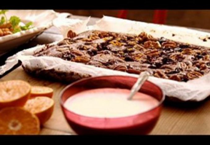Leve o chocolate ao processador e acrescente a manteiga, o açúcar, o cacau em pó, o gengibre com um pouco de sua calda, uma pitada de sal e a farinha com fermento. Mexa e acrescente os ovos. Quando chegar a uma textura cremosa, pare de bater e reserve. Pegue uma assadeira de 30cm por 15cm e forre com o papel-manteiga lavado e untado. Coloque a massa na assadeira e espalhe bastante para formar uma espessura não muito além de 2cm. Acrescente cerejas amargas sobre a massa junto com nozes pecã e um pouco das raspas da casca de uma tangerina. Leve ao forno a 200ºC por cerca de 12 a 14 minutos, corte e sirva.