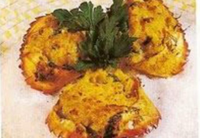 Faz-se um refugado e cozem-se nele os caranguejos. Depois descascam-se, tentando não partir a casca exterior, que se lava e seca e onde se servirão depois. Desfia-se muito bem toda a carne a que se junta um pouco de piri-piri. Depois de passado o refogado e ajustados os temperos faz-se com ele um creme, juntando um pouco de leite. Demolha-se pão em leite e cerveja. Junta-se depois ao creme os caranguejos desfiados e o pão e levam-se ao lume a apurar. Recheiam-se as cascas, pincelando com gema de ovo e cobrindo com pão ralado, e levando, por fim a aloirar em forno moderado.
