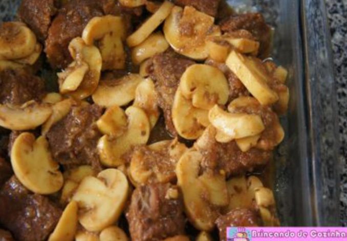 Se estiver no ponto ideal, retire a carne (reserve) e acrescente o champignon em lâminas no caldo e retorne ao fogo baixo. Dissolva a farinha de trigo em ½ xícara (chá) de água e coloque no molho mexendo até ficar encorpado. Desligue o fogo. Acomode a carne em um refratário e espalhe o molho de vinho e champignon por cima.