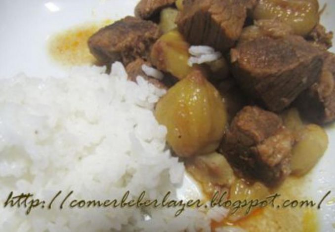 Em primeiro lugar coza as castanhas com um pitada de sal, descasque logo após terminar a cozedura e reserve. Depois, faça um refogado na panela de pressão com a cebola, o alho e o tomate picados, junte o azeite, o copo de vinho branco, a folha de louro e sal q.b.. Ao levantar fervura junte a carne aos cubos e deixe cozer por cerca de 20 minutos. Depois de cozida a carne junte as castanhas e deixe cozer por mais 5 a 10 minutos. Acompanhe com arroz branco e uns grelos cozidos. No copo opte pelo vinho tinto.