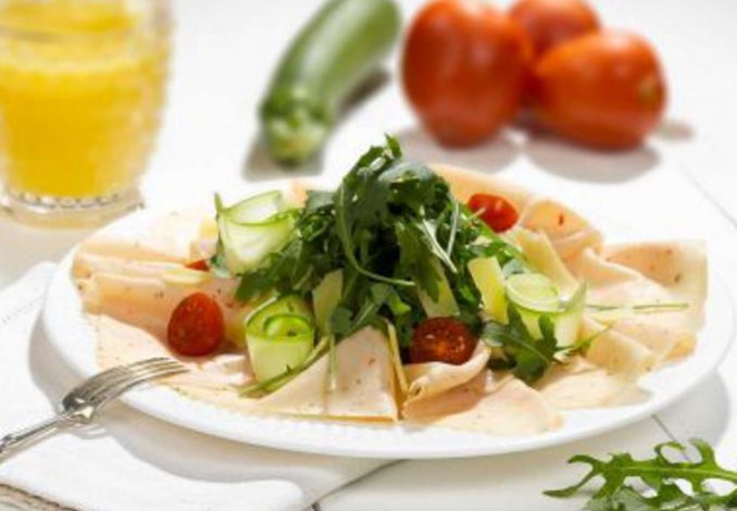 Juntar o sumo de laranja, o balsâmico, a mostarda e o mel num frasco. Tapar e agitar. Cortar as curgetes com um descascador de forca no sentido longitudinal. Cortar o queijo em lascas finas. Distribuir as fatias de Peito de Peru com Ervas Primor no fundo do prato. Temperar a curgete e rúcula com a vinagreta de laranja e coloca-las no centro do prato sobre o Peito de Peru com Ervas Primor. Distribuir o tomate cherry cortado em metades pelo prato. Fazer o mesmo com o parmesão. Decorar com algumas folhas de salva.