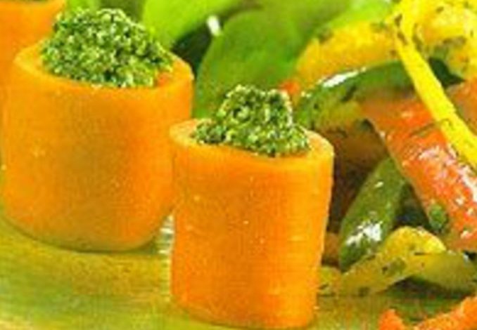 Lave as cenouras e cozinhe-as numa panela (tampada) com 2 litros de água fervente por 30 minutos, ou até ficarem macias. Retire do fogo, escorra a água, elimine a casca das cenouras e corte-as em 12 pedaços de 3 a 4 cm de altura. Com um descaroçador de maçã, retire a parte central das cenouras sem perfurá-las.