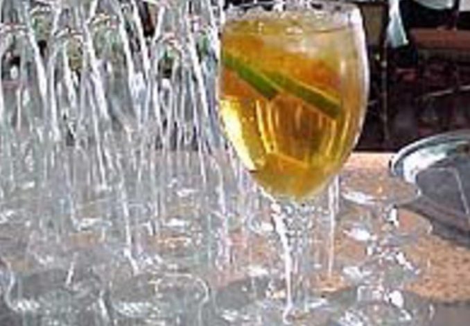 Descasque a pêra e os pêssegos, corte em cubos e coloque na jarra. Despeje o vinho sobre as frutas e misture delicadamente. Acrescente o gelo e um pouco de água com gás. Pode-se preparar esta receita utilizando champanhe.
