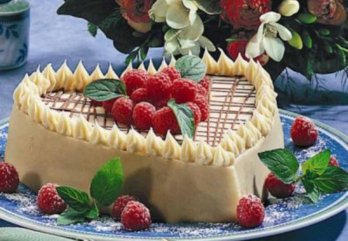 Bata espumosamente a manteiga com 100g de açúcar e a pasta da vagem de baunilha. Separe os ovos das gemas e claras e adicione as gemas 1 após 1 à massa de manteiga. Adicione a farinha também à massa de manteiga e agite após as 4 gemas com a massa de pão. Bata as claras de ovos com 50g de açúcar em castelo e envolva cuidadosamente com a massa. Despeje a massa numa forma em coração barrada com manteiga e alise. Leve a cozer em forno pré-aquecido a 180 °C por cerca de 40 min. Retire o bolo do forno e desenforme sobre uma grade e deixe arrefecer. Corte o bolo depois de frio 1x na horizontal. Para o creme de manteiga: Faça o pudim seguindo as instruções da embalagem e deixe arrefecer. Adicione a manteiga amolecida à colherada no pudim morno e mexa bem até obter um creme bem cremoso. Despeje 1/3 do creme de manteiga sobre o fundo do bolo e cobra com a segunda parte do bolo. Barre as bordas do bolo com 1/3 de creme de manteiga e leve o bolo ao frio para arrefecer bem. Para a decoração: Aqueça a cobertura de chocolate e decore o bolo com uma grade usando um saco de confeitar ou um saco de congelação fazendo um furo no bico. Amasse o massapão com o açúcar em pó e estique o massapão em uma tira fina. Coloque a tira de massapão em torno do bolo e pressione ligeiramente a tira de massapão na borda do bolo. Despeje o restante creme de manteiga em um saco de confeitar com a ponta em estrela e decore a superfície do bolo com pequenos tufos. Em seguida decore a torta com as framboesas e com a hortelã.