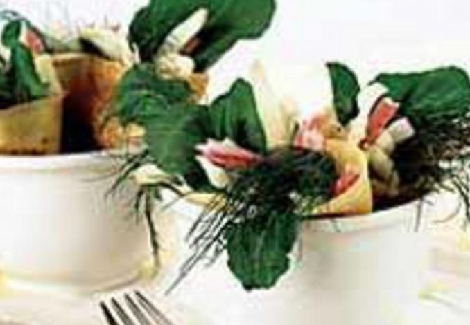 Pincele um dos lados dos crepes com a maionese temperada com as ervas frescas e divida-os ao meio. Distribua a erva-doce, a rúcula e o kani entre as metades dos crêpes e enrole como um cone. Amarre com a cebolinha verde e sirva.