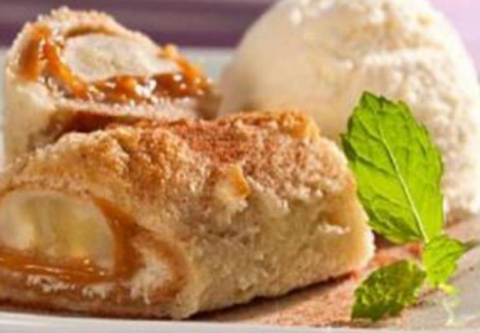 Corte as bananas ao meio no sentido longitudinal. Abra as fatias de pão de forma com o rolo de macarrão, até ficarem bem fininhas. Em seguida, passe 1 colher de doce de leite em cada fatia e por cima coloque meia banana. Enrole como um rocambole e prenda com um palito. Umedeça com um pouco de leite, coloque em uma assadeira untada com margarina e asse no forno preaquecido a 200 °C até dourar. Retire os palitos, polvilhe o açúcar misturado com a canela, decore com folhas de hortelã e sirva com uma bola de sorvete.