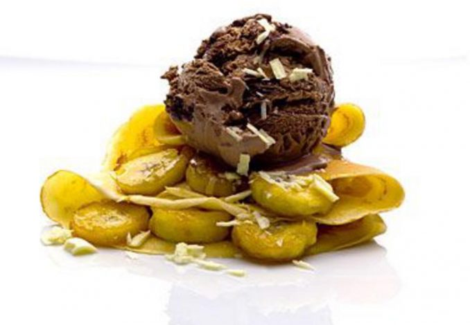 Prepare a massa para os crepes conforme as instruções da embalagem. Unte levemente uma frigideira antiaderente com Vaqueiro Líquida, leve ao lume, deixe aquecer bem. Cozinhe os crepes como habitualmente. Descasque as bananas e corte-as em rodelas. Derreta um pouco mais de Vaqueiro Líquida na mesma frigideira, junte as bananas, polvilhe com açúcar e deixe caramelizar. Divida pelos crepes dobrados em quatro, coloque 2 a 2 em cada prato de serviço e por cima disponha uma bola de gelado Carte d’Or Fever for chocolate Sirva salpicado com raspas de chocolate branco.