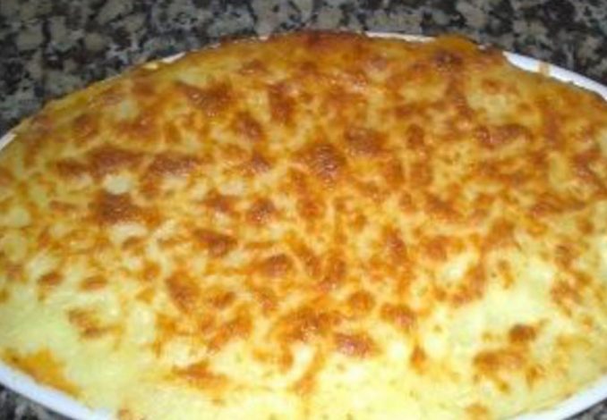 Preparar o puré. Num tabuleiro colocar uma camada do puré, uma camada de carne e outra camada de puré. Por cima colocar queijo mozzarella. Levar ao forno cerca de 20 minutos para tostar.