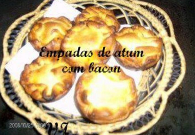 • Numa frigideira coloque o azeite, o tomate desfeito com um garfo, a sopa de cebola , o bacon e um pouco de alho e deixe refogar um pouco. Junte o atum bem escorrido e mexa, refresque com um pouco de vinho branco.3 Retire do lume e deixe arrefecer um pouco. Entretanto barre as formas de empada com manteiga e corte rodelas de massa(2 rodelas). Coloque uma rodela de massa em cada forma, encha com o recheio , coloque uma azeitona(sem caroço) em cada empada e cubra com outra rodela de massa. Faça o mesmo as restantes. Pincele com um ovo batido e leve ao forno pré- aquecido cerca de 20 minutos