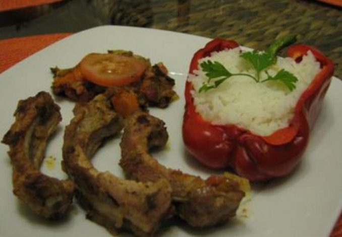 Servir o arroz dentro da "metade" de pimento vermelho, o entrecosto, e fatias de tomate fresco.