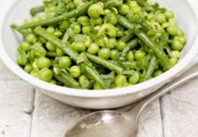 LEVE A FERVER uma caçarola grande com água e acrescente o feijão verde. Deixe cozer durante 2 minutos, acrescente as ervilhas e deixe mais 4 minutos. Escoe e deixe num passador até secar.