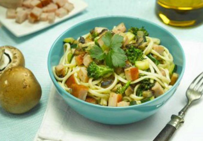 Cozer o esparguete em água com sal. Entretanto, numa frigideira com um fundo de azeite, saltear o Bacon de Peru Primor cortado em cubos até ficar dourado. Retirar o Bacon de Peru Primor e saltear a curgete cortada em cubos com a casca, os cogumelos e os brócolos cortados em pequenos pedaços. Quando o esparguete estiver cozido (deve ficar ligeiramente al-dente) escorrer, e com um coador passá-lo por água fria para lhe retirar a goma. Juntar o Bacon de Peru Primor e o esparguete aos legumes e envolver tudo aquecendo. Temperar com sal e pimenta e se for necessário juntar um fio de azeite. Polvilhar com salsa e servir.