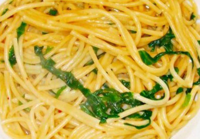 Depois do esparguete estar cozido, coloca-se numa frigideira a manteiga e os alhos picados. Picam-se os espinafres e acrescenta-se (eles vão reduzir bastante quando cozinhados). Deixa-se cozinhar 1 minuto. Acrescenta-se esparguete e mexe-se. Tempera-se com um pouco de pimenta, mexe-se novamente e está pronto a servir.