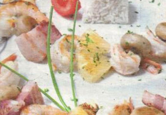 Prepare as espetadas colocando alternadamente nos espetos camarão, toucinho fumado, ananás e cogumelos. Leve ao lume uma frigideira antiaderente com um fio de azeite e deixe aquecer. Junte as espetadas e deixe-as cozinhar durante 5 minutos de cada lado. Retire-as e coloque-as num prato.