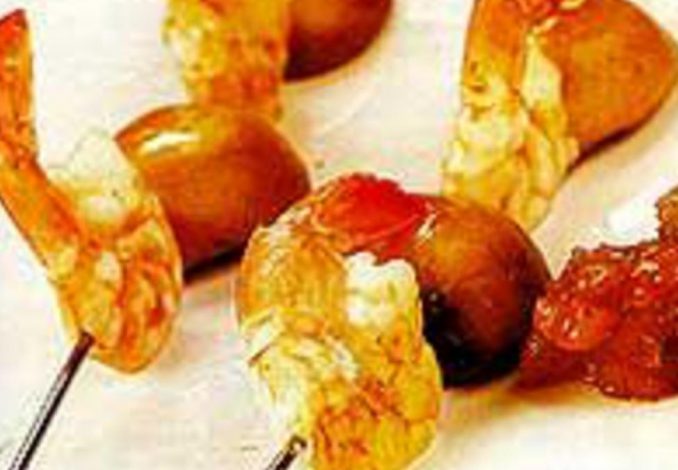 Lave bem as nêsperas, elimine os pedúnculos e, com uma faca pequena, retire as sementes. Com 4 palitos para churrasco, monte os espetinhos. Coloque em cada um 3 camarões, alternando com as nêsperas.