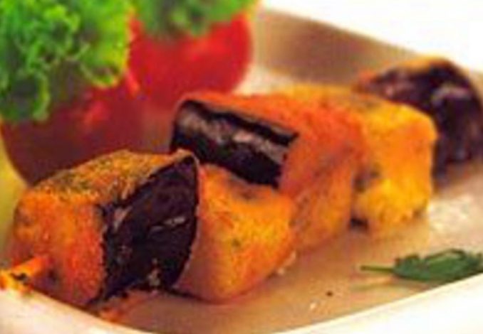 Monte 4 espetinhos, distribuindo de maneira alternada os cubos de berinjela e de queijo-de-minas empanados.