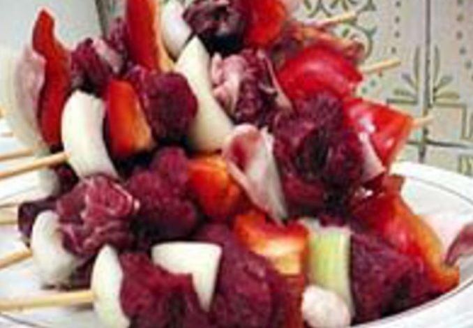 Corte o filé em cubos de 3 cm, corte o pimentão em quadrados de 3 cm, fazendo o mesmo com a cebola.