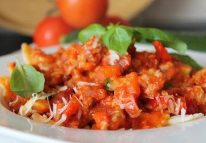 Tempere de sal e pimenta e adicione a polpa de tomate. Tape e deixe reduzir (deve demorar uns 10 minutos). No final junte uma mão-cheia de mangericão picado.
