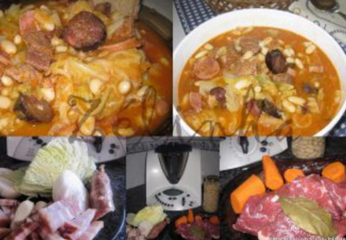 5- Adicione a carne de vaca, o louro, o caldo de carne, 150 g de água, a malagueta. Coloque a Varoma com a couve, os enchidos e programe 40 Min/Varoma//Vel .