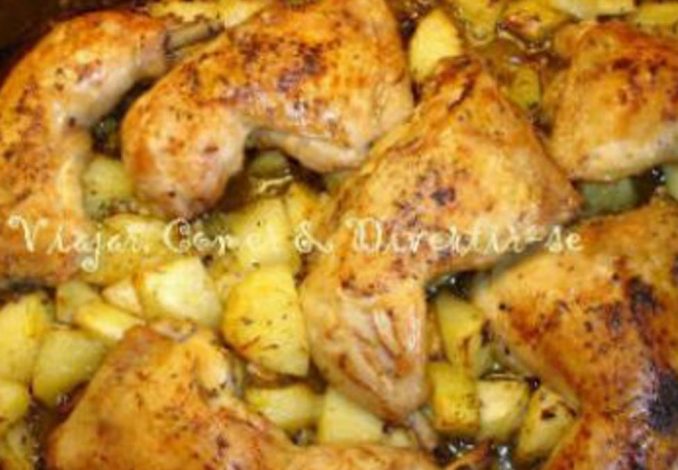 Etapa 1: Esfregue bem o frango com alho e sal. Deixe repousar 1 hora. Etapa 2: Corte as batatas em cubos.Junte tudo numa travessa de ir ao forno. Desfolhe um ramo de alecrim e espalhe por cima da travessa. Etapa 3: Regue com azeite e aromatize com os temperos, do alecrim à pimenta. Coloque nozes de margarina sobre a carne e as batatas. Corte os topos a 2 limões e junte-os à travessa. Etapa 4: Leve ao lume por 45 minutos a 180º. Vire as pernas do frango e as batatas e leve por mais 15 minutos. Esprema o sumo dos limões assados por cima da carne e das batatas.