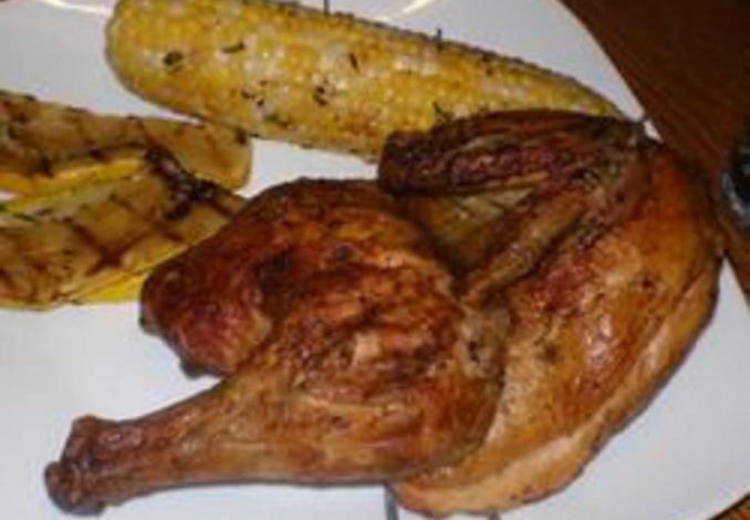 Acenda o grelhador,o faça ao ar live com carvão. Leve ao lume numa panela pequena o vinagre,o óleo,sal e o tempero de frango e deixe ferver. Mande uns murros no frango para amaciar a carne. Entretanto meta o frango na grelha e pincele com o molho e deixe assar bem. Sugestão acompanhe com uma maçaroca de milho cozido ou assado.