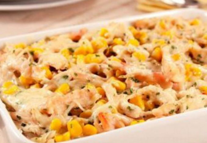 Corte os frangos em 4 partes. Aqueça a manteiga numa forma e frite os pedaços até alourar. Salpique com sal e pimenta. Acrescente o milho e 4 colheres (sopa) do caldo deste. Aqueça a manteiga ou a margarina para o molho. Junte a farinha e mexa até alourar. Acrescente o leite e ferva durante 5 minutos. Misture à parte o creme de leite, as gemas, o sal, a pimenta e a noz-moscada. Junte ao molho e não deixe mais levantar fervura. Bata as claras em castelo, acrescente ao molho e despeje sobre o milho. Salpique com farinha e leve ao forno pré-aquecido por 45 minutos.