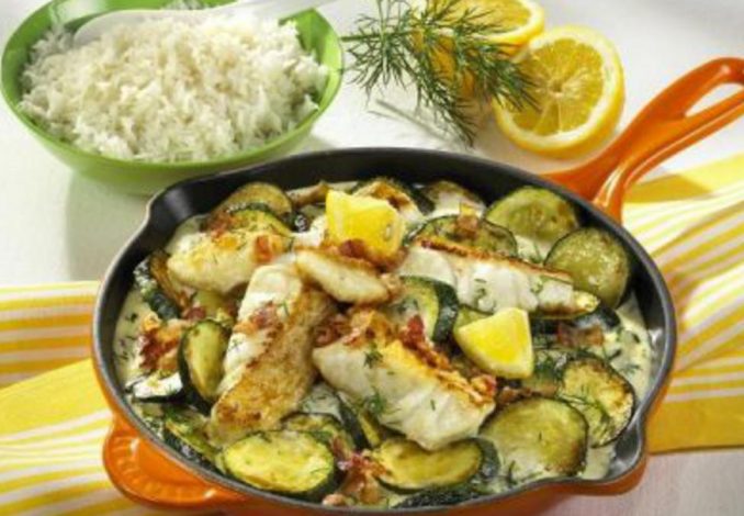 Adicione o caldo de carne e as natas, acrescente o bacon e deixe ferver, mexendo e deixe cozinhar por 2-3 min. Lavagem, seque e pique finamente o endro. Adicione o endro (reserve algum para polvilhar) ao molho e tempere com sal e pimenta. Polha os pedacos de peixes na frigideira sobre o courgette e deixe aquecer brevemente e aquecer. Polvilhe com o restante endro e sirva com o arroz.