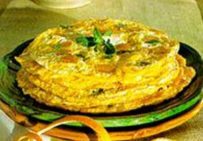 Leve ao fogo uma frigideira antiaderente de cerca de 15 cm de diâmetro e aqueça bem. Coloque a manteiga e deixe derreter, em fogo baixo. Despeje 1/4 da mistura preparada e deixe em fogo médio até desprender do fundo da frigideira. Vire a fritada e cozinhe do outro lado. Repita a operação até esgotar os ingredientes e obter 4 fritadas finas.