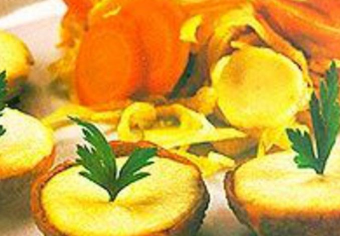 Disponha os fundos de alcachofra numa assadeira e distribua o creme. Leve ao forno por 5 minutos, ou até dourar a superfície. Retire do forno, distribua os fundos de alcachofra nos pratos e decore com folhas de salsinha.