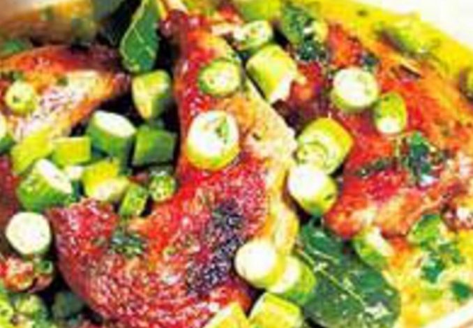 Frite os quiabos (para retirar a baba) numa panela com óleo quente. Escorra e junte à panela com a galinha. Acerte o tempero e adicione a cebolinha-verde cortada finamente.