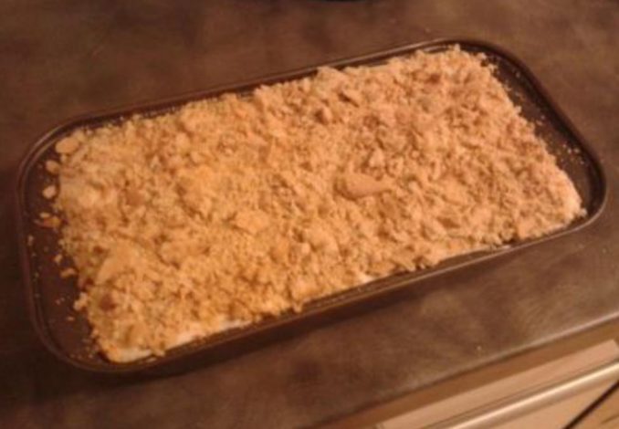 No intervalo de cada camada, colocar bolacha maria esmagada em pedaços generosos.