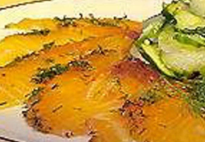 Fatie o salmão finamente em diagonal, mantendo a pele. Sirva com pepinos agridoces.