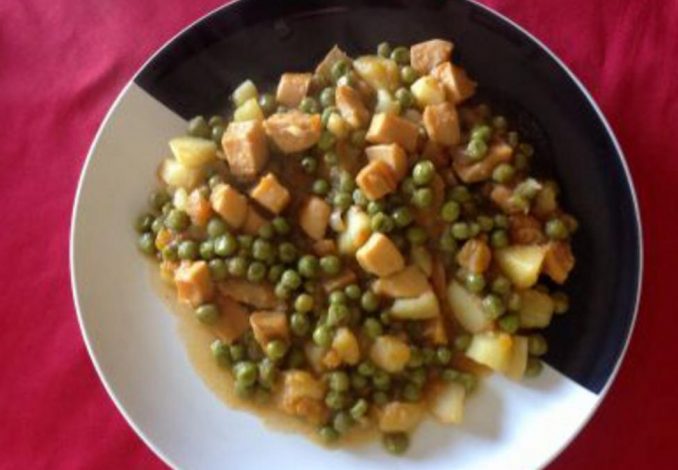 2. Coza o choco juntamente com o refogado e as cenouras cortadas finamente. Quando estiver praticamente cozido, junte as ervilhas e as batatas.