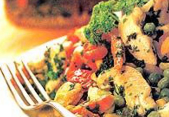 Em uma frigideira, aqueça a manteiga, junte as tiras de frango e frite-as, sem parar de mexer, por 12 minutos, ou até dourar. Incorpore a cenoura, os tomates, as ervilhas, o milho, a salsinha, o sal e a pimenta-do-reino. Cozinhe por mais 5 minutos, mexendo de vez em quando.