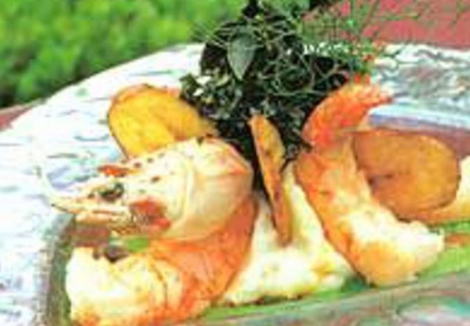 Coloque o purê no centro de um prato, distribua em volta os lagostins e intercale as rodelas de banana frita. Por cima, distribua a couve e em volta o molho bem aquecido.