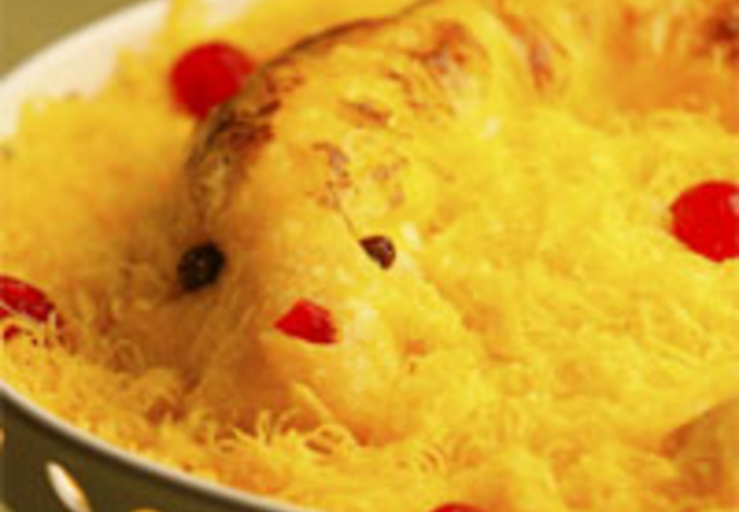 1. Preparam-se 3 dúzias de ovos em fio e 2 dúzias em trouxas, sem as enrolar. 2. Fazem-se os ovos-moles com os ingredientes descritos acima e juntam-se-lhes as amêndoas peladas e finamente raladas. Leva-se ao lume brando para engrossar. 3. Coloca-se uma terça parte dos fios de ovos no prato onde se vai servir, dando-lhes a forma de lampreia. Por cima deita-se o preparado de ovos-moles e amêndoa e cobre-se esta com mais fios de ovos. 4. Colocam-se as «capas» das trouxas sobre o conjunto anterior, sobrepondo-as e moldando-as, de modo a ficar com a forma da lampreia (embora bastante menos comprida). A cabeça deverá ser maior do que a cauda. 5. Faz-se um pouco de caramelo escuro (mas sem queimar, pois amarga) e deita-se sobre parte do corpo da lampreia e, depois, com o glacê de açúcar branco desenham-se os olhos, a boca e escamas na ponta da cauda. 6. Colocam-se as passas e a cereja cristalizada de forma a desenhar os olhos e a boca da lampreia. Contorna-se toda a lampreia com fios de ovos e em cima mais algumas cerejas cristalizadas. Dica: O açúcar, caramelo e o glacê só se aplicam no dia em que a lampreia será comida, pois em contacto com a calda das trouxas, têm tendência para derreter.