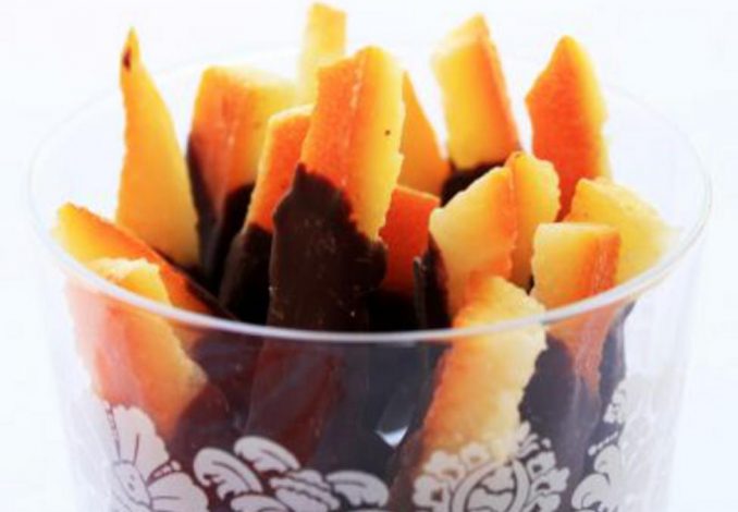 Lavar e descascar as laranjas com uma faca bem afiada. Cortar em tiras. Colocar num tacho água abundante e as cascas e ferver durante 5 minutos. Escorrer a água e voltar a repetir o processo mais duas vezes. Num tacho, colocar a água e o açúcar e deixar ferver, mexendo sempre. Juntar as cascas e deixar cozinhar, em lume brando, durante 1hora. Colocar a calda com as cascas num recipiente e levar ao frigorífico durante 5 dias para macerar (não encurte este processo, visto que é o que confere a maciez às cascas). Escorrer as cascas e deixar a secar durante 24 horas numa rede. Derreter o chocolate e molhar cada casca no chocolate. Deixar secar em cima de papel vegetal.