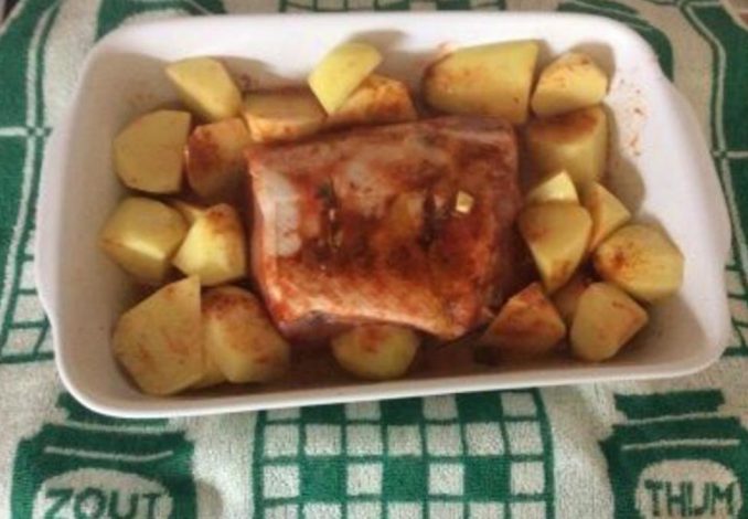 Por fim leve ao forno a cerca de 180 graus, por uma hora e meia, pode juntar batatinhas ou então batatas cortadas em pedaços para acompanhar.
